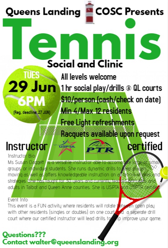 QL Social Committee Event Tennis Tennis Social and Clinic on Tuesday, June 29th at 6 PM. All levels welcome. We will have 1 hour of social play / drills at the Queen’s Landing Courts under the instruction of USPTA and USPTR certified instructor Susan Cleggett. She has taught for 30 years in Queen Anne and Talbot counties. Price reduced: $10 per person (cash or check to be given to instructor on the date) Minimum 4 participants required, Max of 12. Free light refreshments will be provided. Racquets available upon request. Contact [email protected] or [email protected] with any questions. Please review the available slots on Sign-Up Genius and click on the button to sign up. Thank you! |